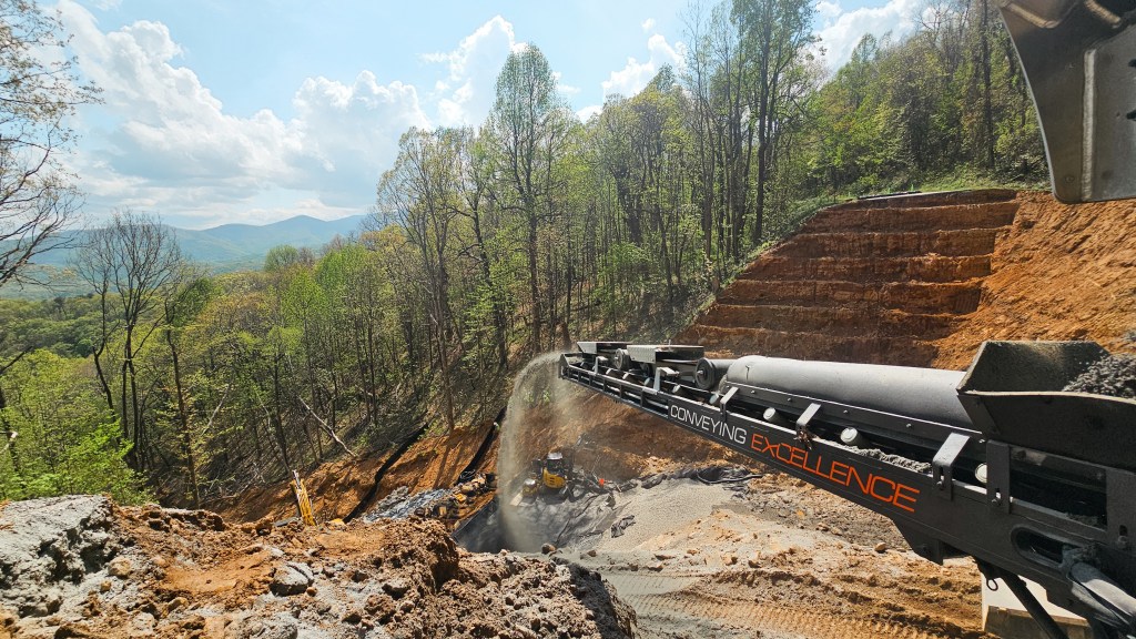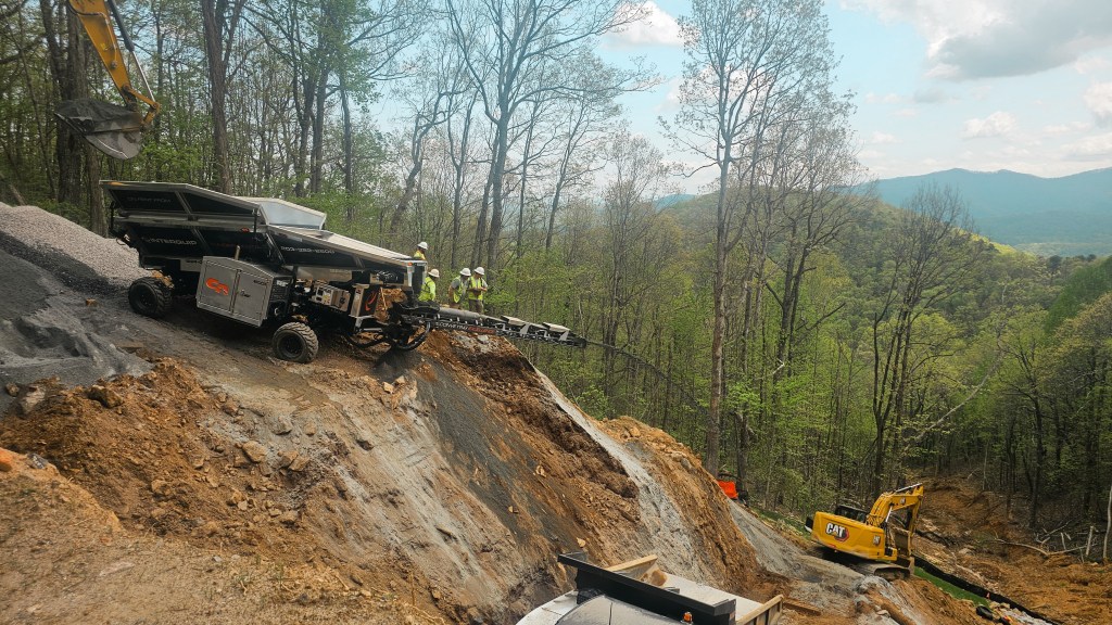 The All Terrain material slinger has an automatic tilting feature that keeps it level even on slopes to provide stability and continuous feeding.